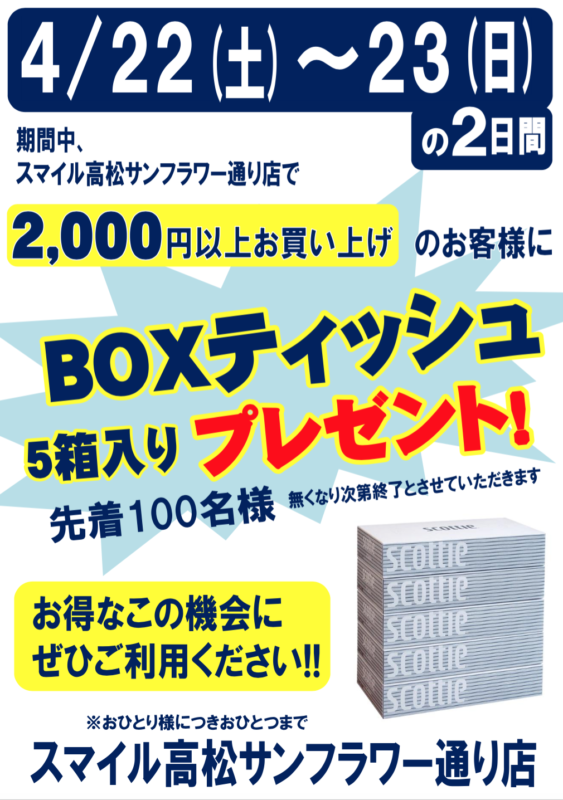 4月22日(土)〜4月23日(日) スマイル 高松サンフラワー通り店 BOXティッシュイベント!