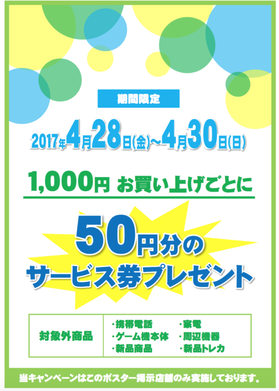 2017/04/27 4月28日(金)〜4月30日(日)ブックオフ店舗 サービス券キャンペーン開催! 4月28日(金)〜4月30日(日) ブックオフウィズのブックオフ店舗(下記のポスター掲示店舗)では、 1,000円お買い上げごとに50円分のサービス券をプレゼントしています! ※対象外商品は、下記のポスターでご確認下さい